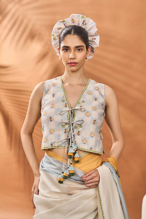 Details: Saree- Beautiful printed saree with yellow and blue stripes print at the palla | Pleats and palla adorned with printed borders | Palla is embellished with applique emboidery placement | Adorned with beautiful tassles Blouse piece- Blouse with all over digital print | Adorned with tassles