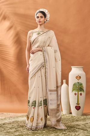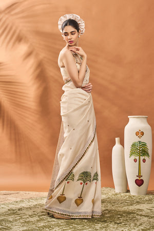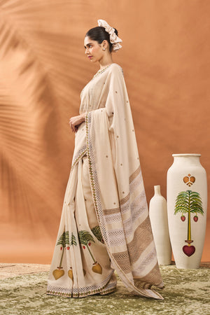 Details: Saree- Beautiful all over printed saree with ivory tree of hearts print| Adorned with colorblocked crochet lace and border Blouse piece- Blouse with placement digital print
