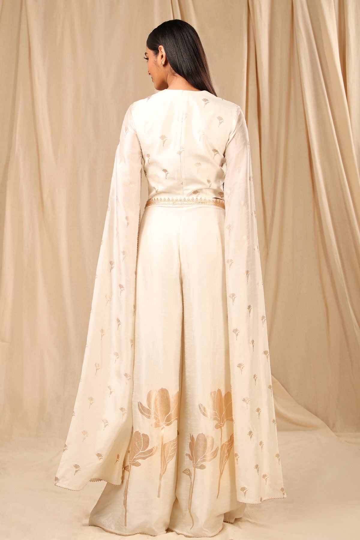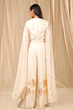 Details: Ivory Wine Garden Palazzo Set - This Ivory Raw Silk Fusion Set comes with a V neck Bustier which is embellished with embroidered scallop border and edged with crystal danglers, it also has winged sleeve which is edged with kinari to dazzel at special occasion! Palazzo has beautiful Wine Garden foil placement print and is edged with kinari and has pockets.