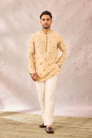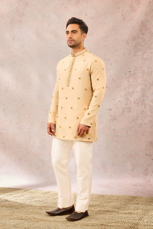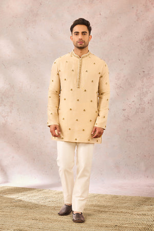 Description:Kaju Katli short georgette tissue kurta is embellished with 'Berry Bel' motif embroidery. It is adorned with embroidered collar and placket to add whimsy to the whole look.