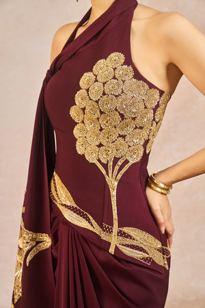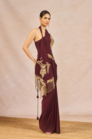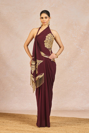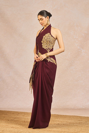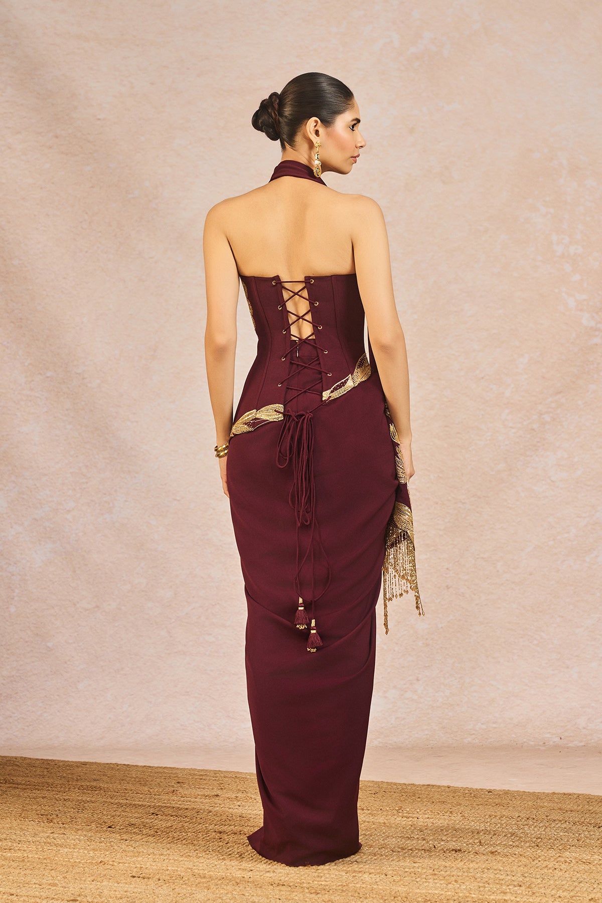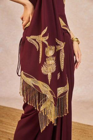 Description: ‘KAREEB SE’ fusion set is where traditional artistry meets modern silhouette, this striking ensemble features a structured corset with an attached embroidered scarf, brought to life with intricate gold sitara, dori, and zardozi work. Inspired by our Vrksh Sitara motif, the corset is paired with a fluid draped skirt that moves with effortless grace. The true showstopper is the embroidered scarf, adorned with our Kolar Mocha motif and finished with delicate crystal tassels. Perfect for weddings, festive soirées, or statement moments this look is a seamless blend of old-world craftsmanship and contemporary glamour.