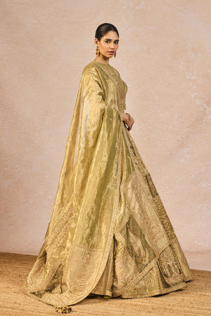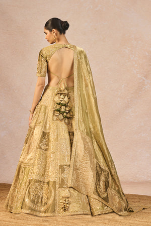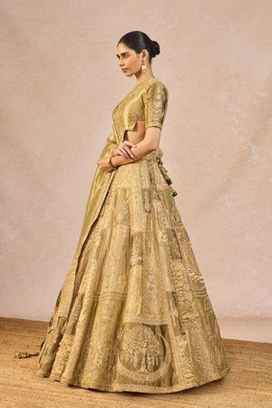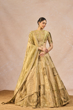 Description: This 'Khwabon Ki Shehzadi' Lehenga artfully blends rich green tones of tissue and organza, with each panel meticulously crafted and adorned with intricate gold embroidery showcasing delicate bagh motifs enhanced by exquisite moti work, sitara kaam, and cutdana handwork. The matching tissue blouse features a structured silhouette, lavishly embroidered in gold to mirror the lehenga’s regal richness. A soft organza dupatta with scalloped hems and subtle gold chaand motifs completes the ensemble, striking a perfect balance between elegance and tradition.