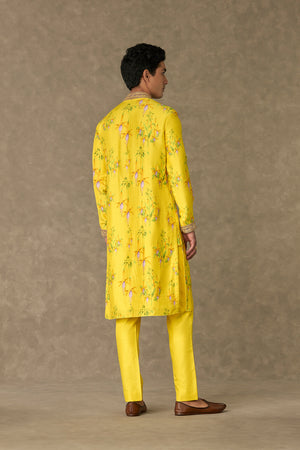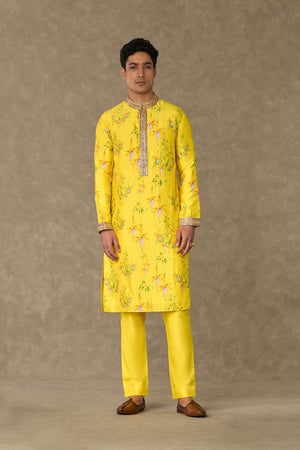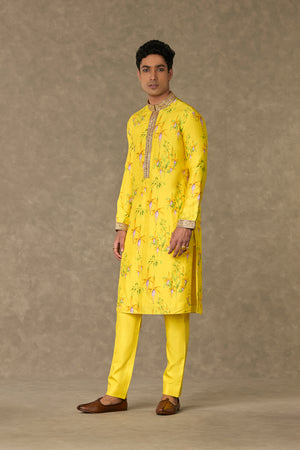 Details: Lemon Yellow Kurta - All over digital printed kurta with full sleeves |Embellished collar, placket and sleeve hem |Pocket detail|Concealed placket|Mandarin collar Pant- Straight pants with pocket