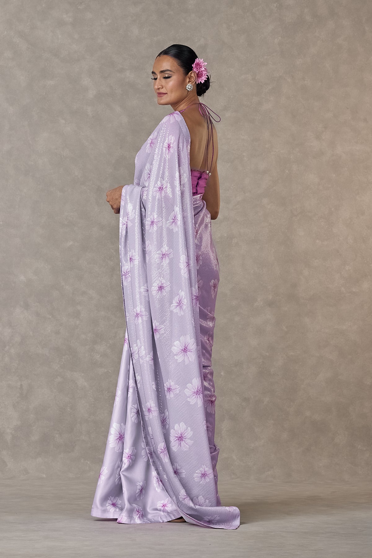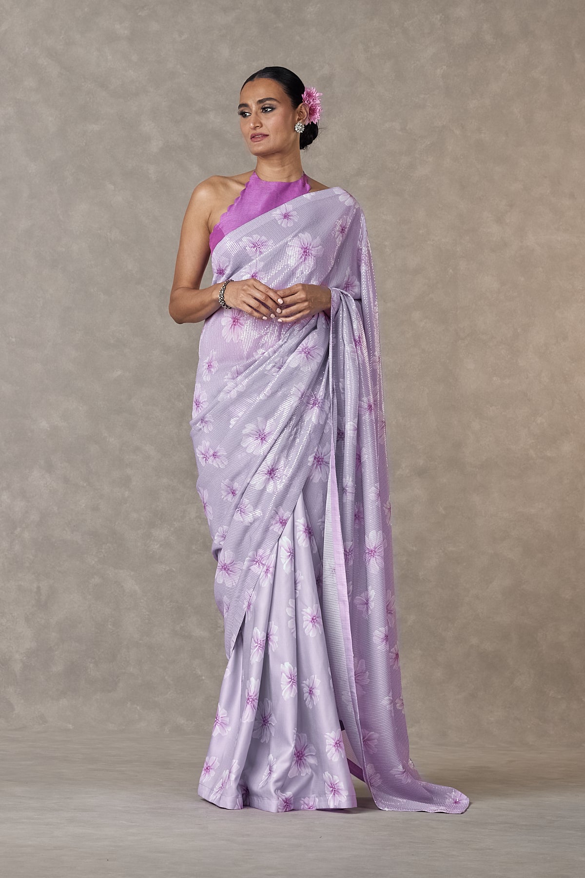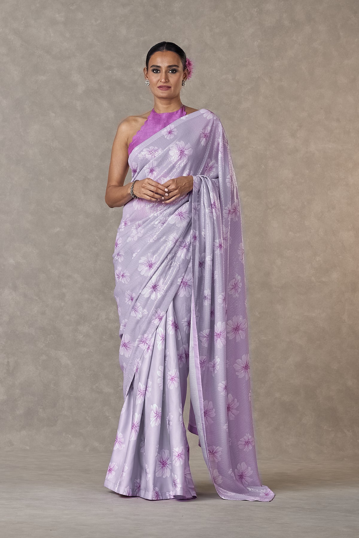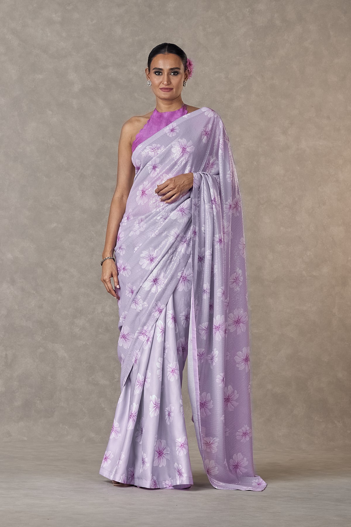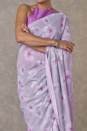 Details: Saree - All over digital printed saree in signature Parijat print | Comes in silk and sitara half & half concept Blouse piece - Lilac blouse piece