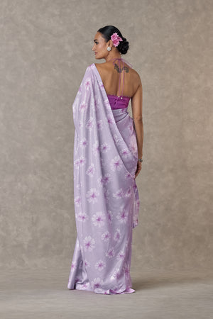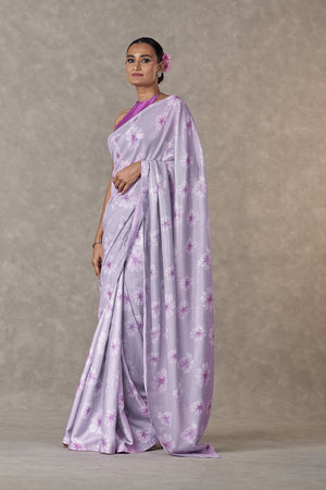 Details: Saree - All over digital printed saree in signature Parijat print | Comes in silk and sitara half & half concept Blouse piece - Lilac blouse piece
