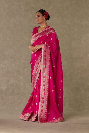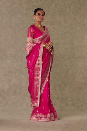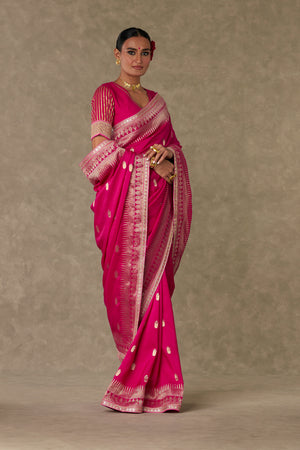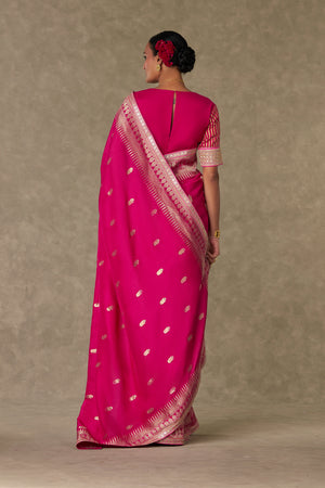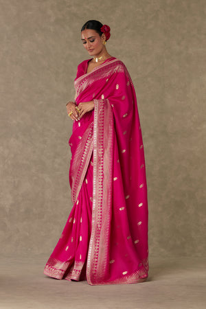 Details: Silk Magenta Saree - Jacquard saree with Trikone and anar zari border | Embellished with embroidered border and edged with kinari Blouse piece - Silk blouse piece embellished with embroidered border and gota silai