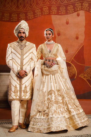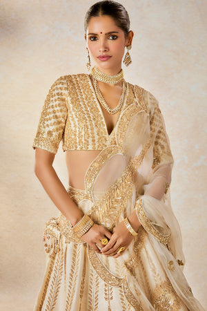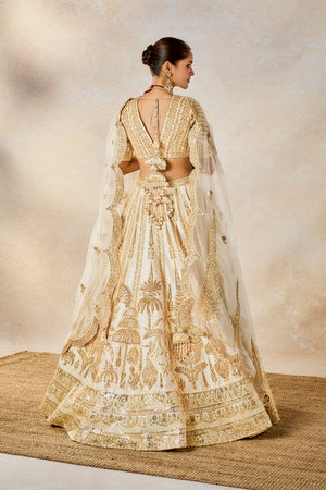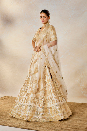 Description:A work of meticulous craftsmanship, this cream-hued silk lehenga brings alive imageries of a tropical rainforest encrusted in gold. Through works of our signature technique of zardozi and moti work, this ensemble represents the soothing yet traditional bride. It is paired with a deep V-neck blouse and a dupatta which has a scallop border with our motifs scattered across the length of it. It could also be paired with our beautiful optional veil embellished with 'Raj pankh' motif gold embroidery.