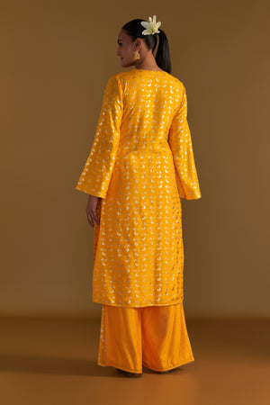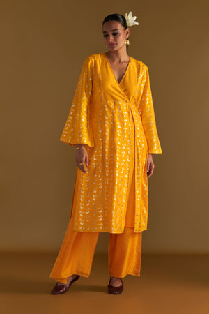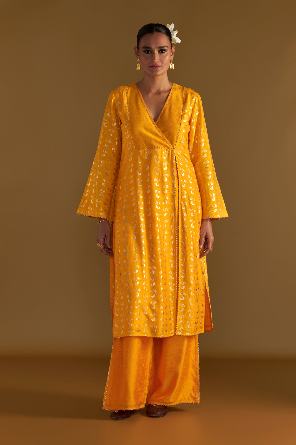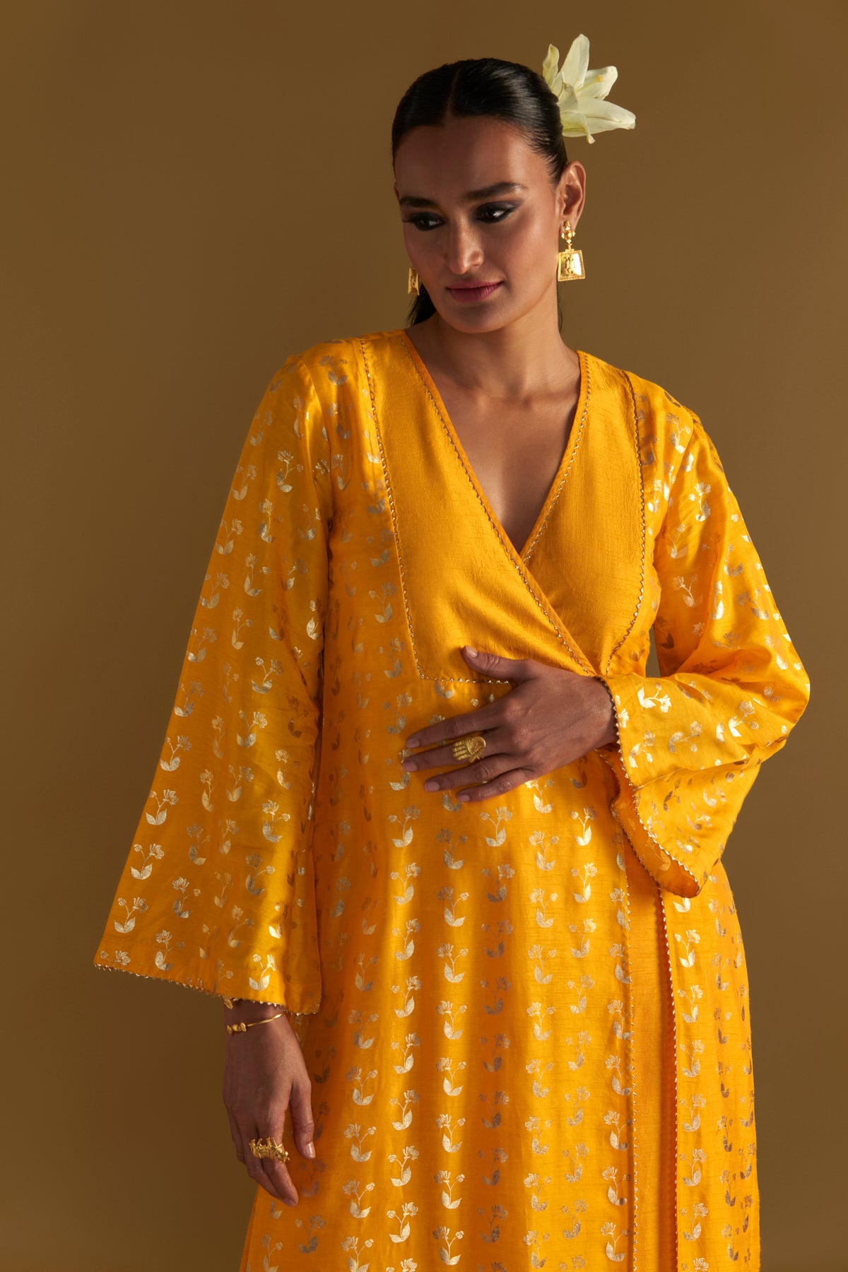 Details: Mango Yellow Springbud Culotte Set - All over foil printed Overlap Kurta edged with kinari | Bell sleeves | Culotte edged with Kinari