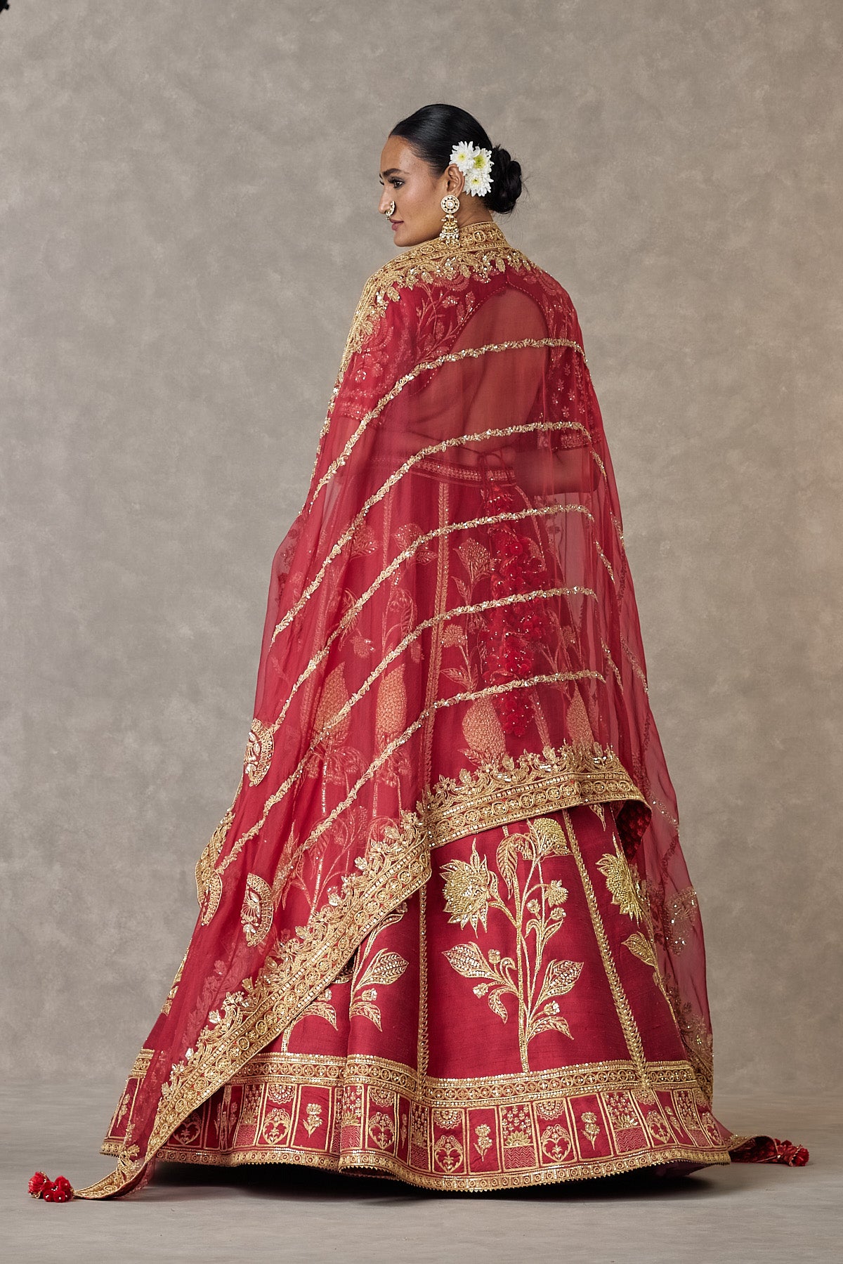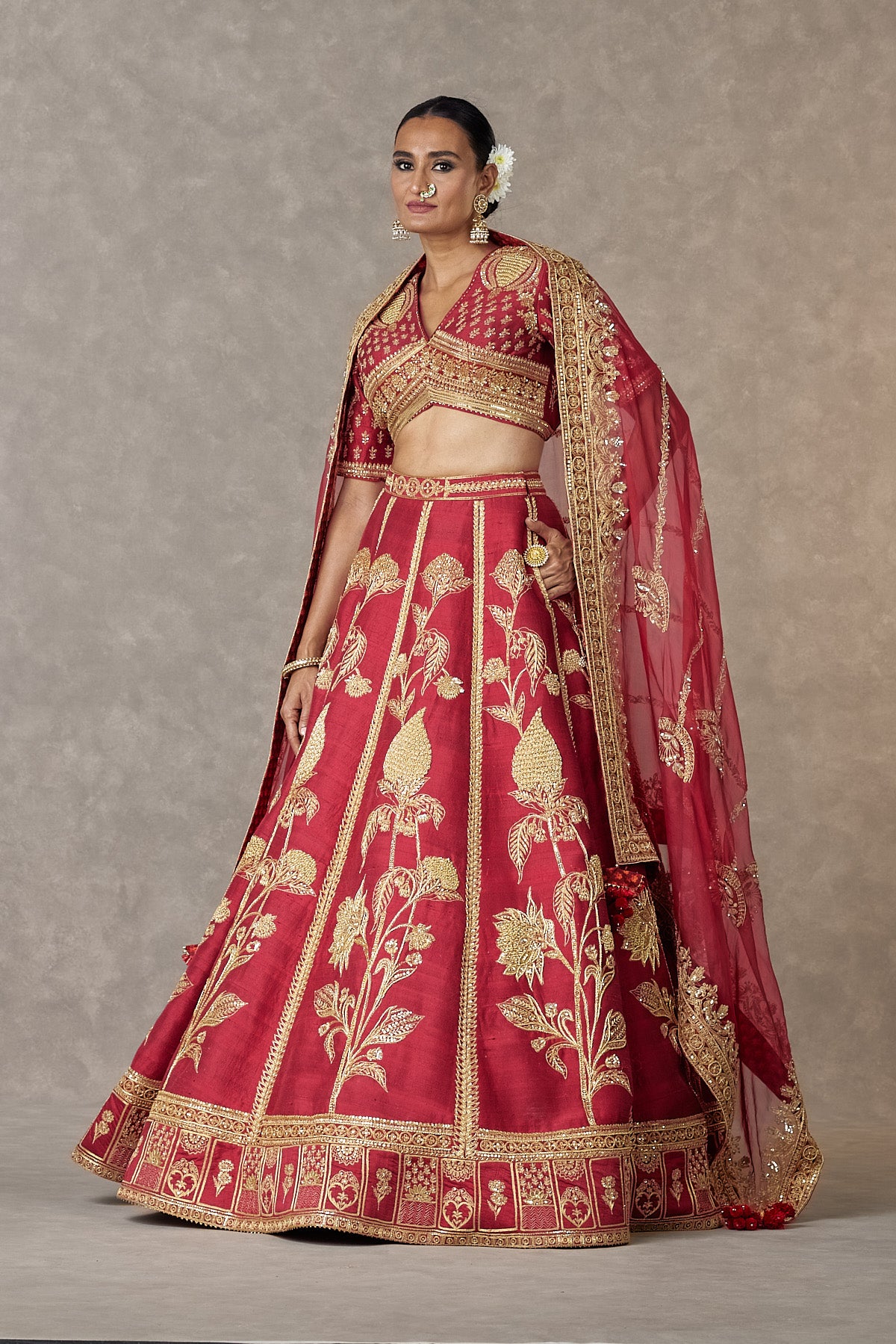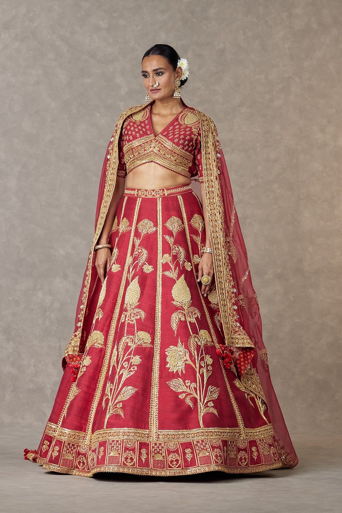 Details: Maroon 'Anar-Phool' Lehenga Set- Lehenga adorned with embroidery with dabka, sitara & dori kaam | edged with kinari |Pocket detail | Side zip closure | Comes with a separate Can Can skirt Blouse- 'V' neckline | Elbow sleeves | Adorned with embroidery with dori, sequins & dabka kaam |Center back opening with tie-up tassel detail | Printed lining Dupatta- Organza dupatta embroidered with sequins |Printed backing |Tassel detail