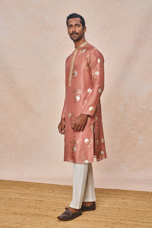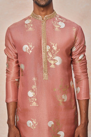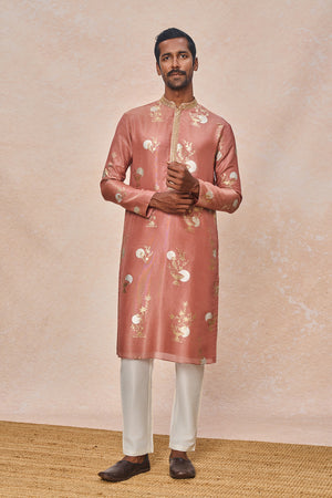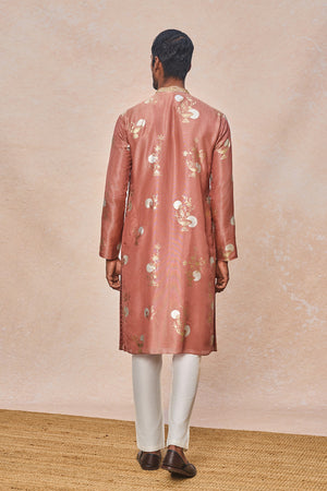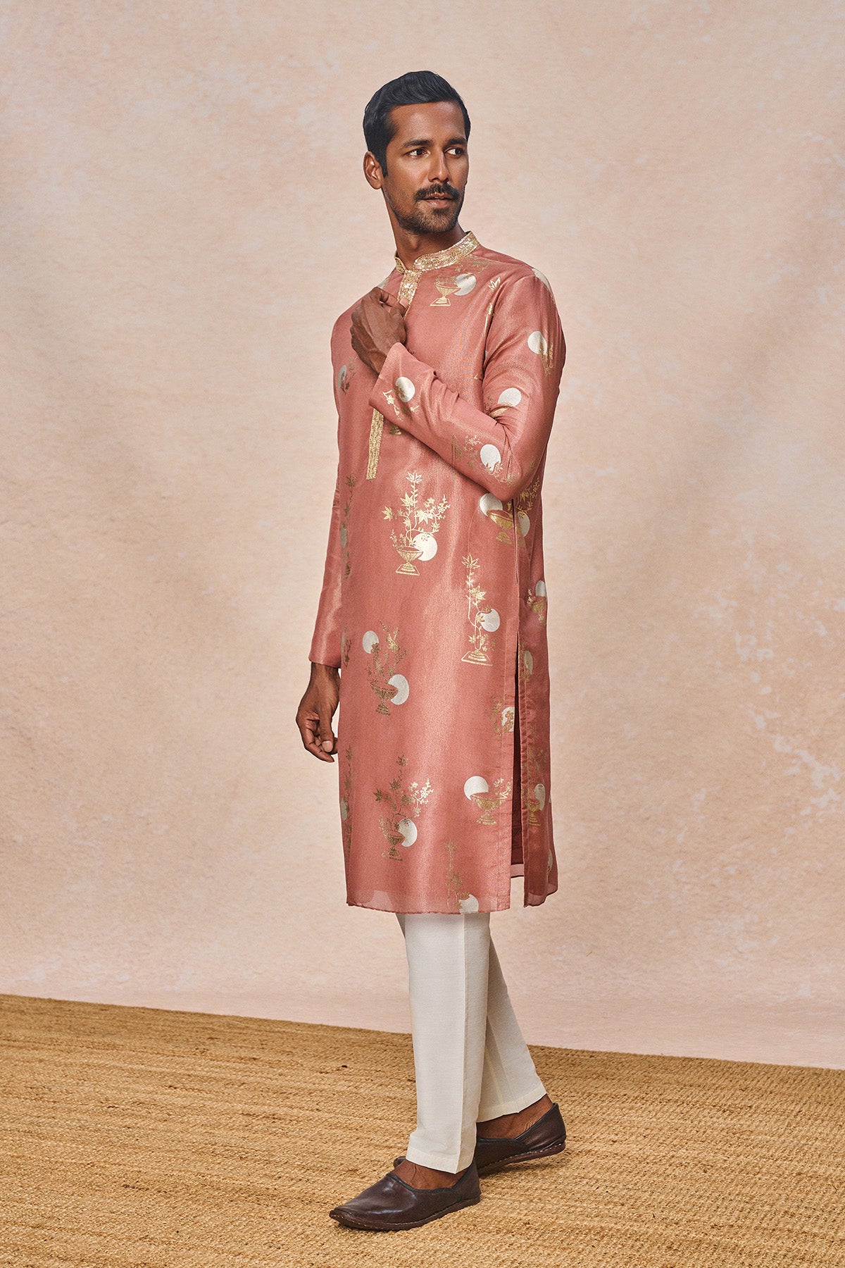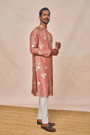 Details: Kurta- All over foil printed kurta | Full sleeves | Mandarin collar | Pocket detail | Concealed placket with gold embroidery Pant- Straight pants with pocket