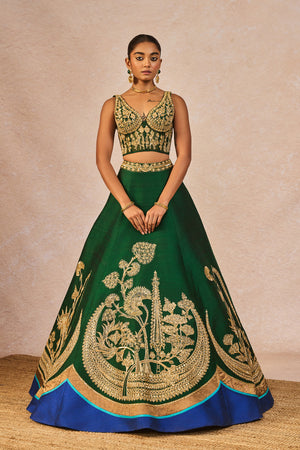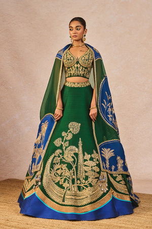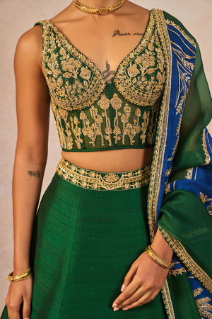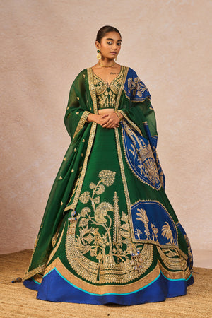 Details: The 'Mehendi Rachke' Lehenga Set- Lehenga intricately embroidered with enlarged 'Chaand' motif | Tissue Patchwork | 6 Kalis | Side Seam zipper closure | Side pockets | Comes with a separate Can Can skirt, Blouse- Plunging V-neckline | Corset body | Centre back closure. Dupatta 1 - Green organza dupatta with contrast blue circular embroidered patchwork all-over. Dupatta 2- Solid bottle green dupatta with delicat eembroidery all-over | Scallop Hem.