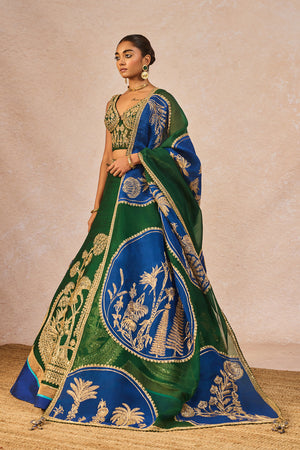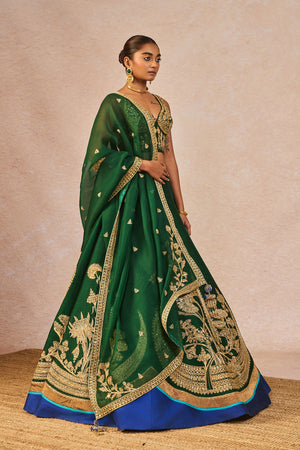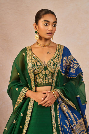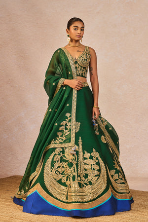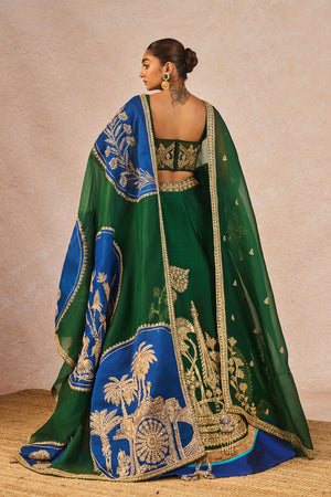 Description: The ‘Mehendi Rachke’ Lehenga Set beautifully showcases intricate bagh motifs, such as 'Bagh-e-Noor', 'Dil Chitra' and 'Gul Chaand' this enhanced with detailed moti work, sitara kaam, and fine cutdana embroidery. Accented with two shades of blue patches, it adds a vibrant pop of color and modern flair to the traditional silhouette. Paired with a structured corset-style blouse, the ensemble exudes refined elegance. Completing the look are two dupattas—one featuring bottle green and blue organza patchwork, and the other in solid bottle green organza—both delicately embroidered in gold and finished with scalloped hems, lending a regal and sophisticated touch to this timeless ensemble.