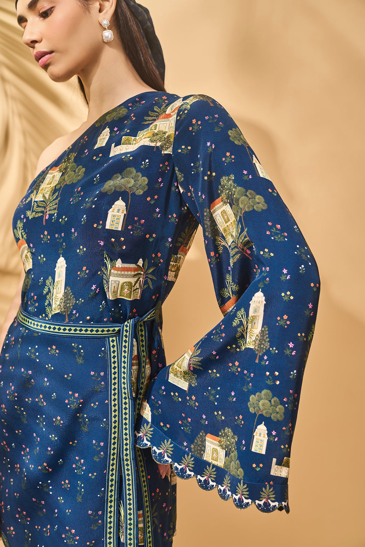 Details: One shoulder mini wrap dress| Wrap over tie-up with tassels attached | Bell sleeve with scallop border detail