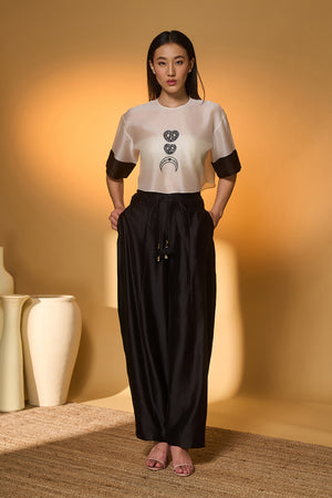 Details: T-shirt Top- Relaxed silhouette | Drop-shoulder | 'Midnight Snack' embroidered on body | Contrast Patti detail on sleeves Barrel pants- Faux-double waistband detail with tie-up detail adorned with tassels | Barrel leg silhouette