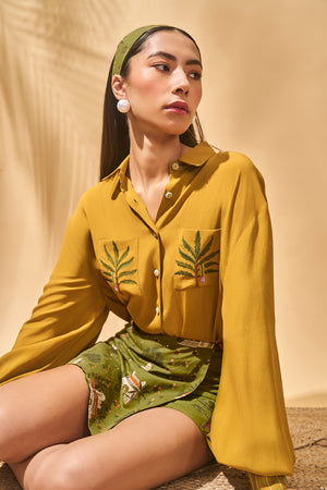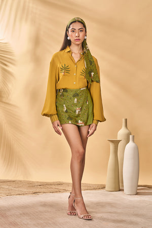 Details: Drop shoulder shirt | Trellis Palm embroidered Patch Pockets | Crochet buttons | Stitch detailing on Cuffs with button closure Skorts- Printed overlap | Trellis Palm Placement on the side | Side seam zipper closure