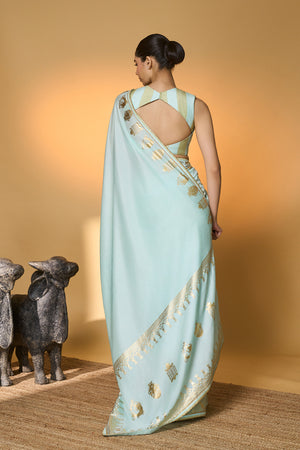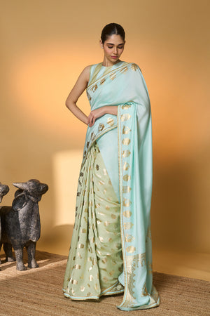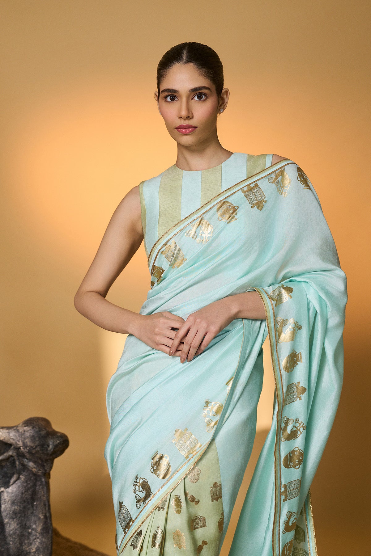 Details: Saree – The saree has all-over foil print | Pallu has amber arches, all charms placements, and all charms print as a border on the Pallu | Pleats have all-over charms foil print | The entire saree is finished with thin gota and a piping. Blouse – The blouse piece comes with baby pink and mint raw silk fabric separately.