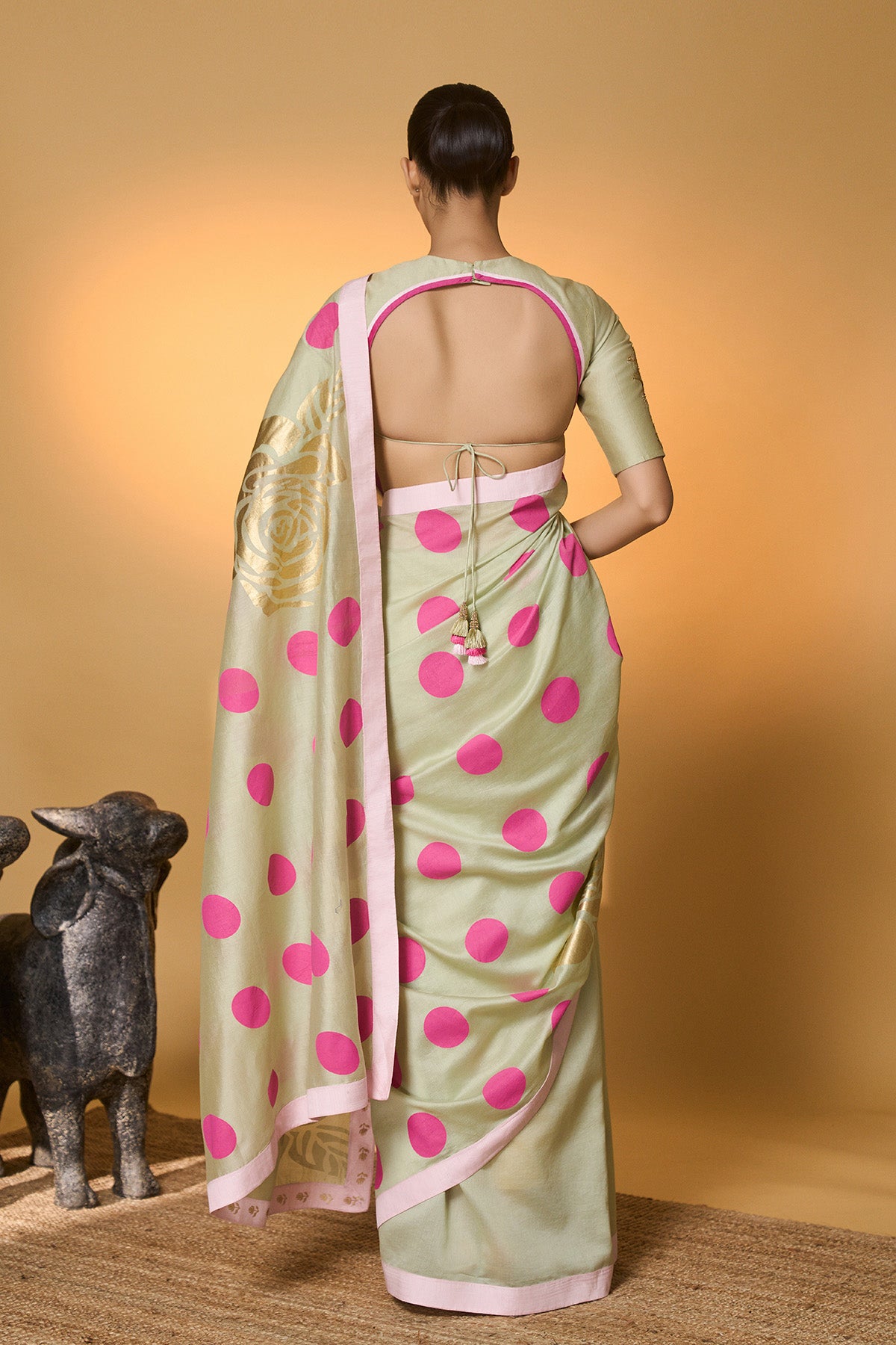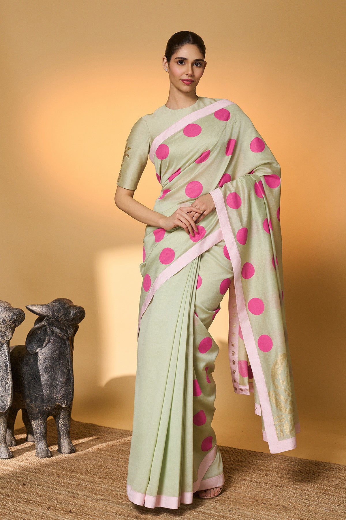 Details: Saree – The saree is in Chanderi with a khadi and foil print | Pallu has a pink ombre khadi print of polka with rose blush foil print | The pleats are solid mint Chanderi | The saree is finished with a solid pink border. Blouse – The blouse piece has a palm tree motif embroidery