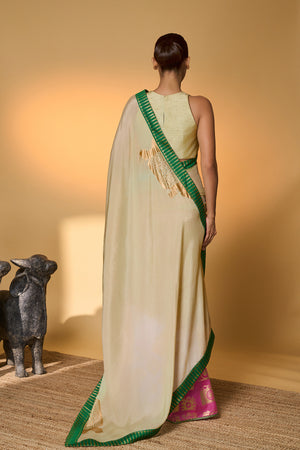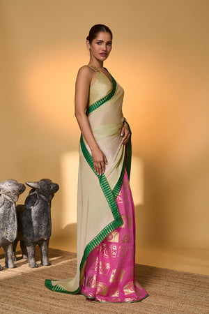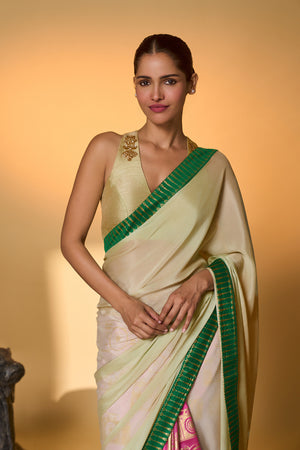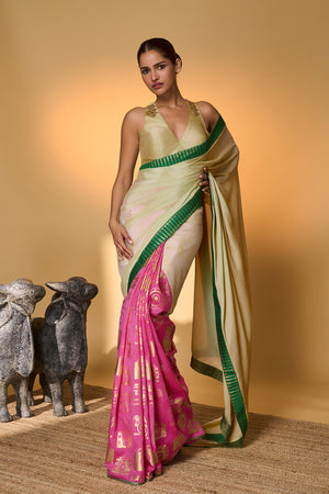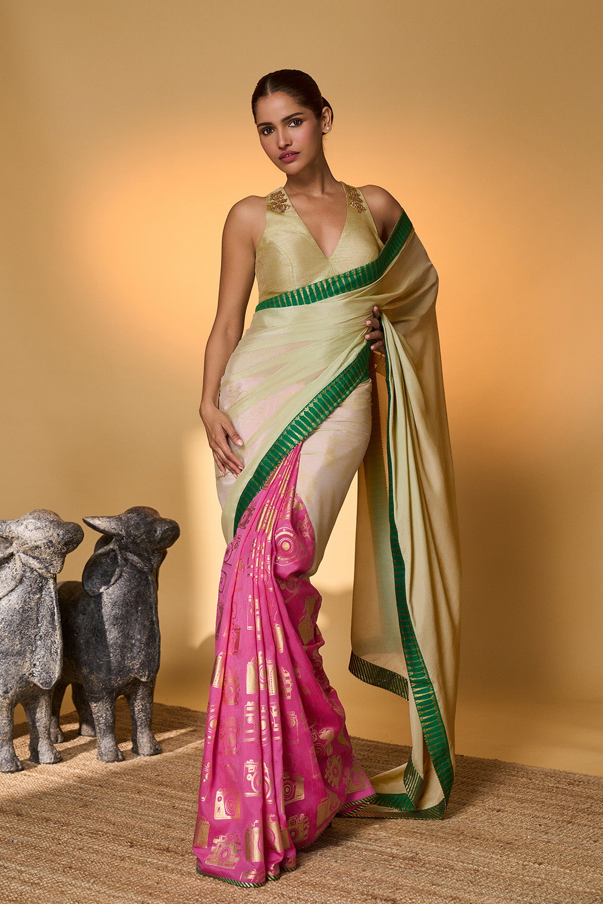 Details: Saree – The saree is half and half with two different fabrics | Pallu is made with chiffon with a placement of turtle tale print and completed with a Sundrop leaf foil print border with a backing of pinstripe | Pleats are in raw silk with a camera foil print all over. Blouse – The blouse piece has two beautifully embroidered motifs.