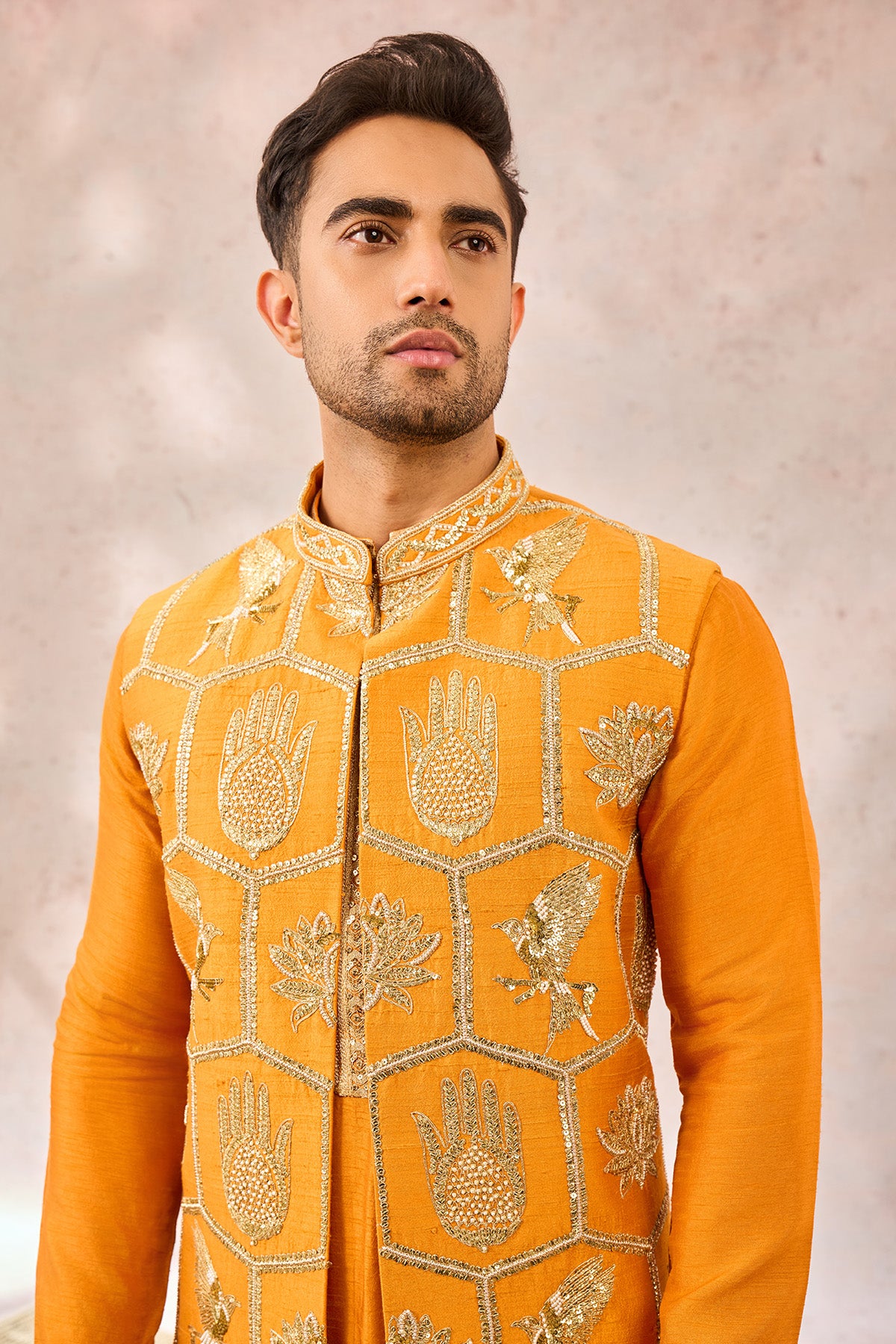 Description: The Mustard Bandi Set is a blend of traditional craftsmanship and modern elegance. The bandi features a unique design with three primary motifs: the Neelkamal, Haathphool and Son Chidiya. These motifs are artistically placed inside hexagonal placements, creating a geometric yet organic flow that balances symmetry with the beauty of nature. This design choice allows the traditional motifs to shine, making the ensemble both striking and timeless