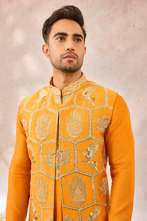 Description: The Mustard Bandi Set is a blend of traditional craftsmanship and modern elegance. The bandi features a unique design with three primary motifs: the Neelkamal, Haathphool and Son Chidiya. These motifs are artistically placed inside hexagonal placements, creating a geometric yet organic flow that balances symmetry with the beauty of nature. This design choice allows the traditional motifs to shine, making the ensemble both striking and timeless