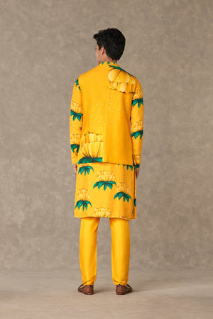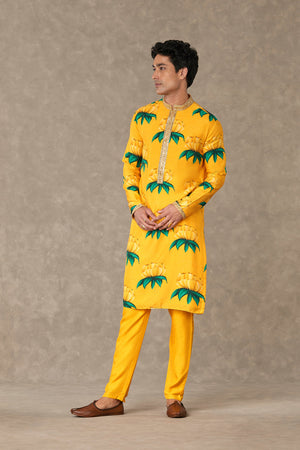 Details: Mustard Masakali Set - Digital placement printed Bandi | Mandarin collar embellished with embroidered border | Concealed placket |Center front opening |Printed lining Kurta- All over digital printed kurta with full sleeves |Collar, placket and sleeve hem embellished with border |Pocket detail|Concealed placket|Mandarin collar Pant- Straight pants with pocket.