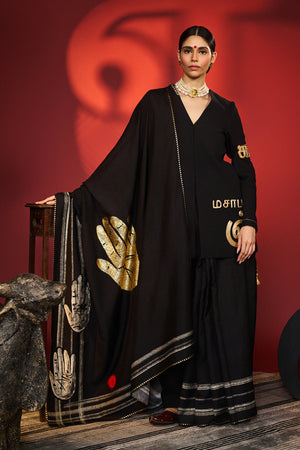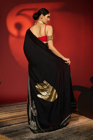 Details: Saree with blouse piece- Never Not Iconic is a statement saree in charcoal black, adorned with bold palm motifs and dynamic strokes in digital print. A touch of gold foil adds luxe with a striking palm accent. Pinstripe piping frames the drape with subtle edge, while the vibrant red blouse brings an unapologetic pop of color.