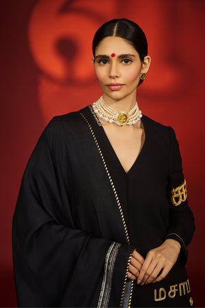 Maroon Etched Bajubandh- The bajubandh is a true masterpiece, intricately adorned with Tamil letters brought to life through exquisite zardozi embroidery. Every intricate thread is meticulously handcrafted, creating an opulent display of artistry. Delicate, handcrafted tassels cascade gracefully, adding a regal, ethereal charm to this exquisite adornment.
