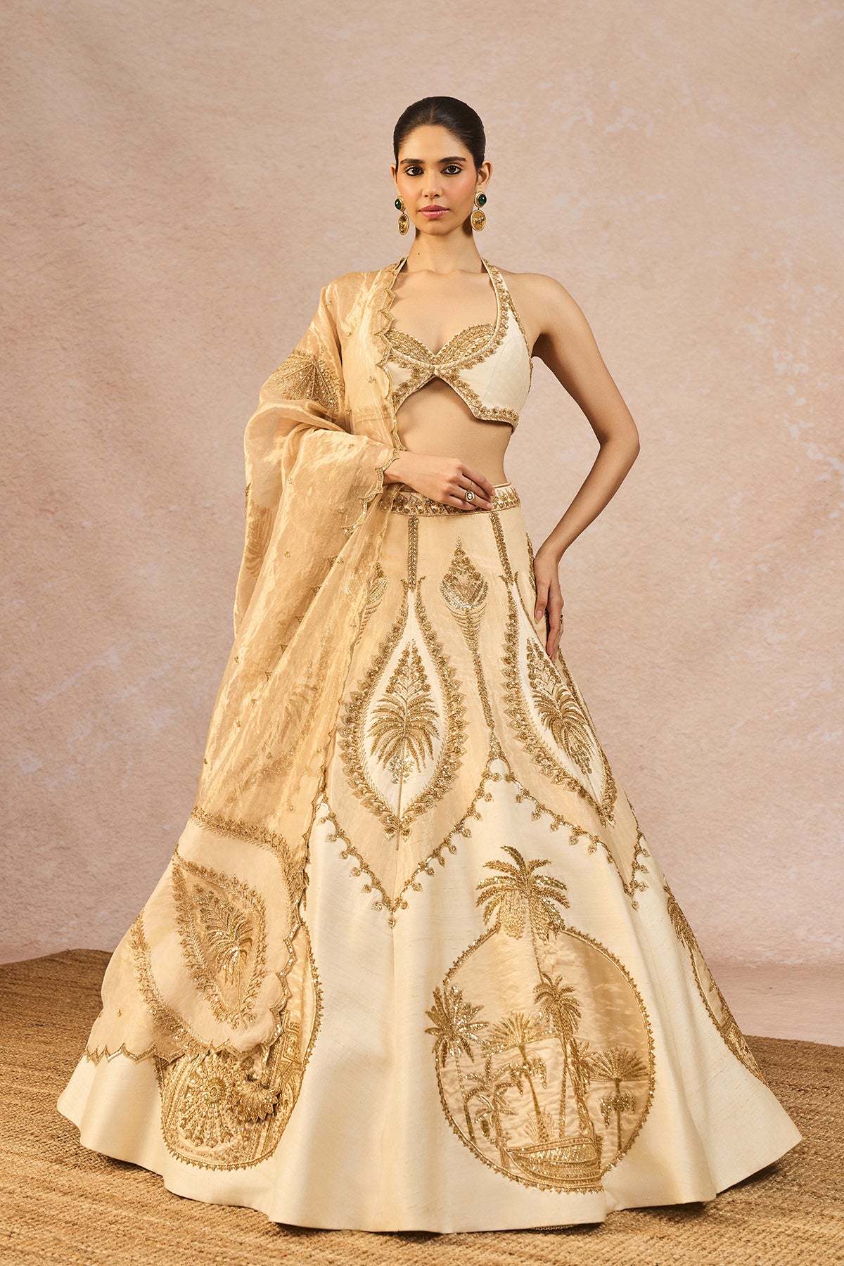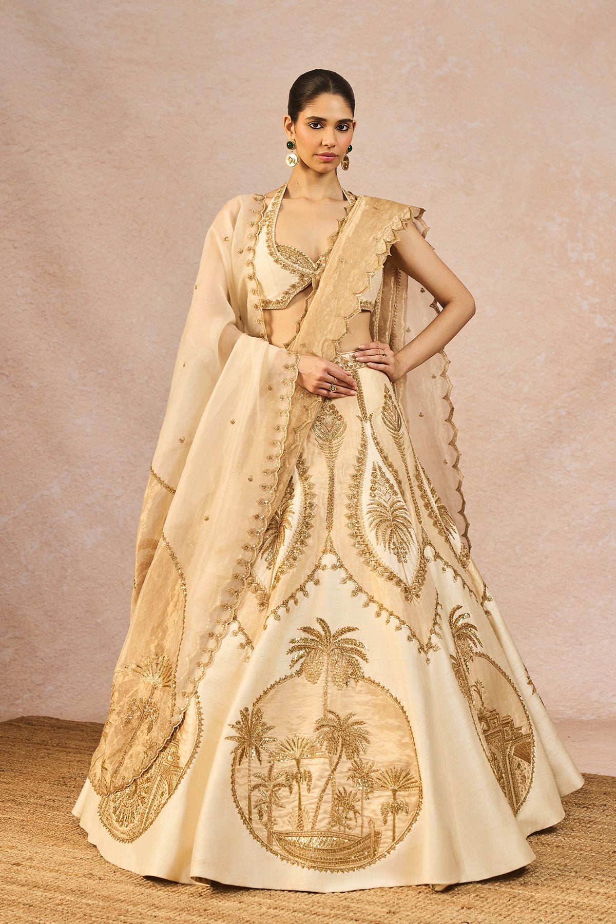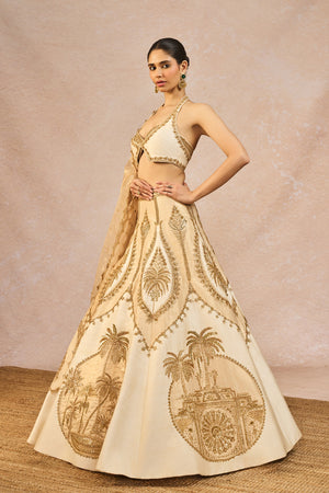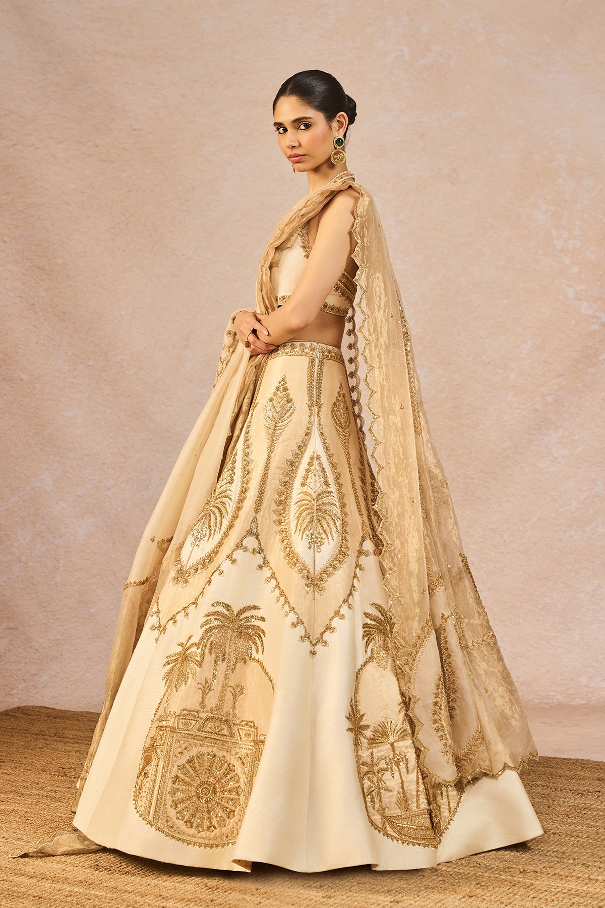 Description: This elegant 'Noor Ban Gaye' Lehenga is adorned with intricate bagh motifs brought to life through detailed moti work, sitara kaam, and delicate cutdana embroidery in rich gold tones. The design features prominent circular tissue patches with 'Chaand Kashti' & 'Dil Chithra' motifs, adding depth and grandeur. Paired with a uniquely styled two-piece blouse that forms a cohesive silhouette, the ensemble is complemented by two dupattas—both in ivory organza with gold tissue —both heavily embroidered with matching motifs and finished with scalloped hemming. The look blends regal tradition with modern finesse, making it perfect for statement occasions.