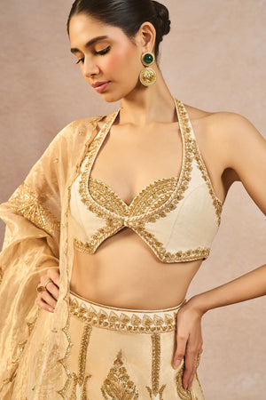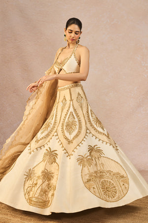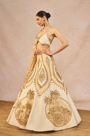 Details: The 'Noor Ban Gaye' Lehenga Set- Ivory Lehenga intricately embroidered with circular tissue patchwork | Each circle alternates of 'Chaand Kashti' & 'Dil Chithra' motifs | 6 Kalis | Side Seam zipper closure | Side pockets | Comes with a separate Can Can skirt, Blouse- Halter neckline | Double layered blouse | Centre back closure. Dupatta 1- Delicate Ivory organza dupatta with 'Gul Jharokha' motif embroidered on tissue patchwork |Dainty butti embroidery all-over| Scallop Border. Dupatta 2- Tissue duppata with 'Gul Jharoka' motif embroidered patchwork | Embroidered buttis all over.