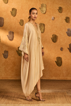 Details: Kaftan – Beautiful embroidery on zen print sleeves | V-neckline highlighted with embroidered border detailing | Center front adorned with an elegant embroidery motif | Backing features a subtle snowlight print