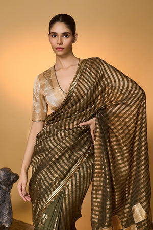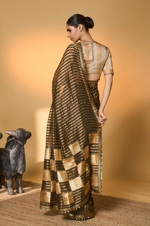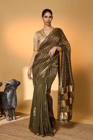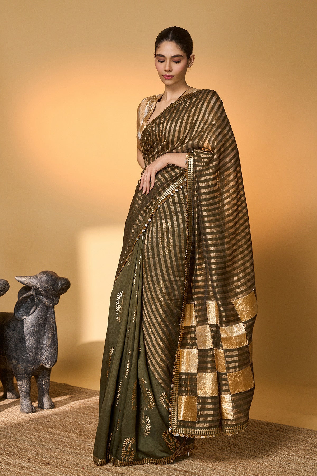 Details: A traditional saree featuring raw silk pleats adorned with foil work all over for a rich textured look. The pallu is crafted in zari stripe tissue, highlighted with lumpi gota embroidered in alternate box patterns. A finely detailed border enhances the elegance of the drape and adds structure to the design. The blouse has embroidered motifs on double color tissue with foil edging, creating a balanced blend of textures. Ideal for festive occasions and celebrations