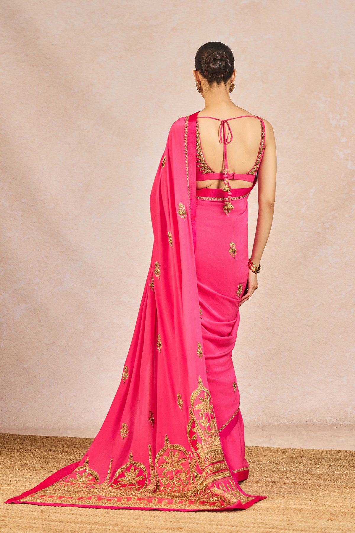 Description: This vibrant saree, crafted in rich tones of pink, exudes timeless elegance with delicate golden floral buti embroidery scattered across the drape. The ensemble is framed with a finely detailed border featuring traditional motifs, reminiscent of intricate jharokha patterns, and is meticulously finished with shimmering dori and sitara kaam. The palla flows gracefully, its hem richly embroidered to create a dramatic and regal trail that adds movement and grandeur. Paired with the saree is a coordinated blouse in matching pink, hand-embroidered with fine golden threadwork along the neckline and straps, offering a subtle yet striking contrast.