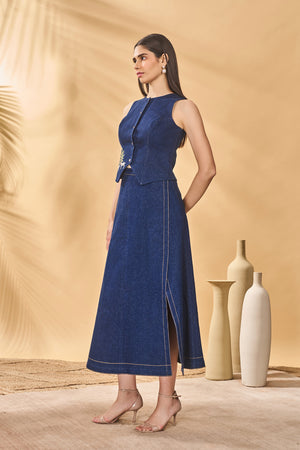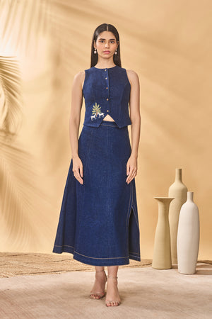 Details: Waistcoat- Round neck | Front button closure | Paw-tree patchwork on front Skirt- A-line | Side slit | Stitch detail along the hem