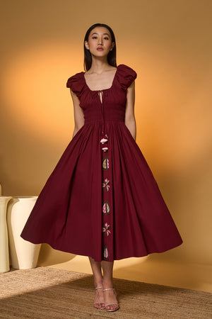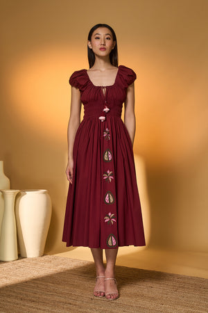 Details: Fit and Flare Silhouette | Split Square Neckline with tie-up detail |Tie-up adorned with tassels | Embroidered 'Pear of Tropics' Front Panel | Flowy Silhouette | Gathered half sleeves