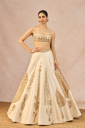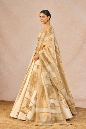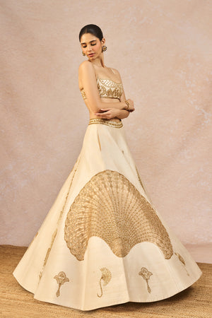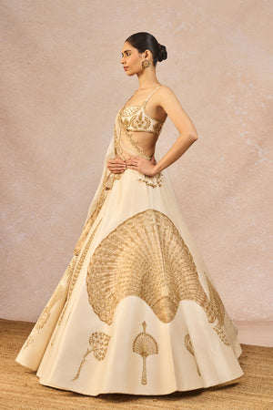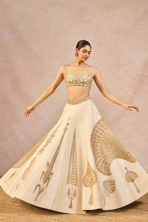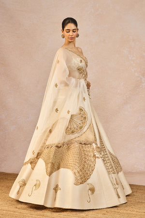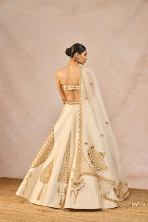 Details: The 'Pehli Kiran' Lehenga Set- Lehenga intricately embroidered with 'Pankha' motifs in each kali| 12 Kalis | Side Seam zipper closure | Side pockets | Comes with a separate Can Can skirt, Blouse- Sweetheart Neckline | Double-layered body| Adjustable strap | Centre back closure. Dupatta 1- Ivory organza dupatta with gold tissue patchwork with 'Pankha' motifs. Dupatta 2- Ivory Organza dupatta with butta embroidery all-over with big 'Pankha' motif placement.