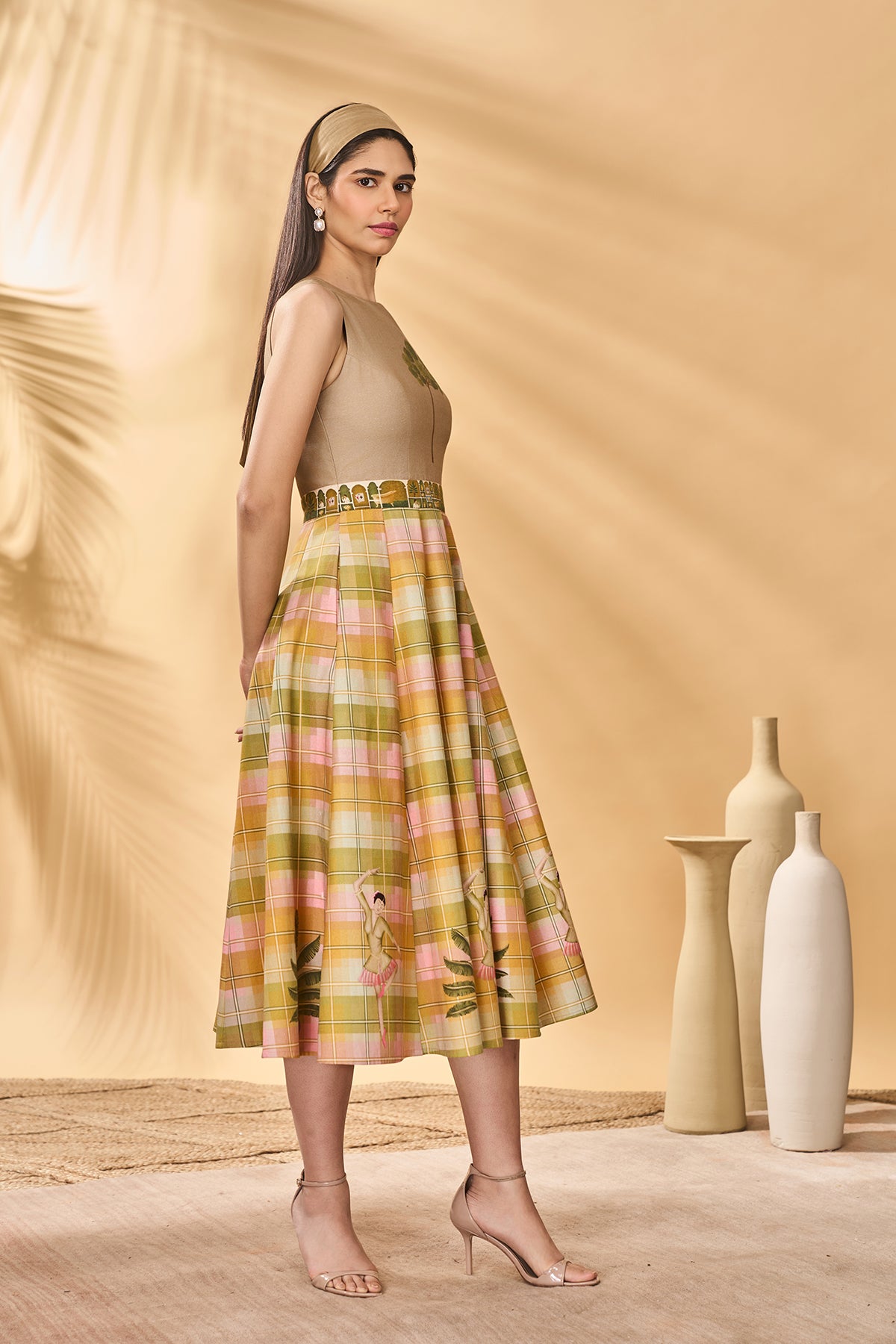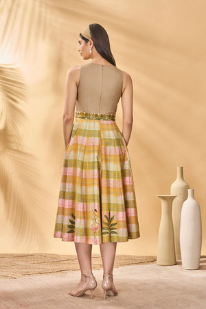Details: Fit and Flare midi dress | Trellis Palm placement on bodice | Pirouette Picnic placements on checkered skirt |Printed belt attached | Side pockets | Centre back zipper closure