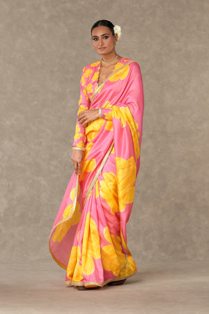 Details: Pink Gulab Saree - All over digital printed saree in signature Gulaab print |Embellished with emboidered border Blouse piece - All over digital printed blouse piece with 'Madakal' neckline