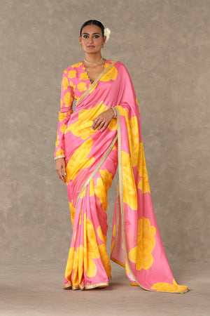 Details: Pink Gulab Saree - All over digital printed saree in signature Gulaab print |Embellished with emboidered border Blouse piece - All over digital printed blouse piece with 'Madakal' neckline