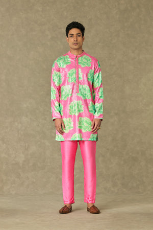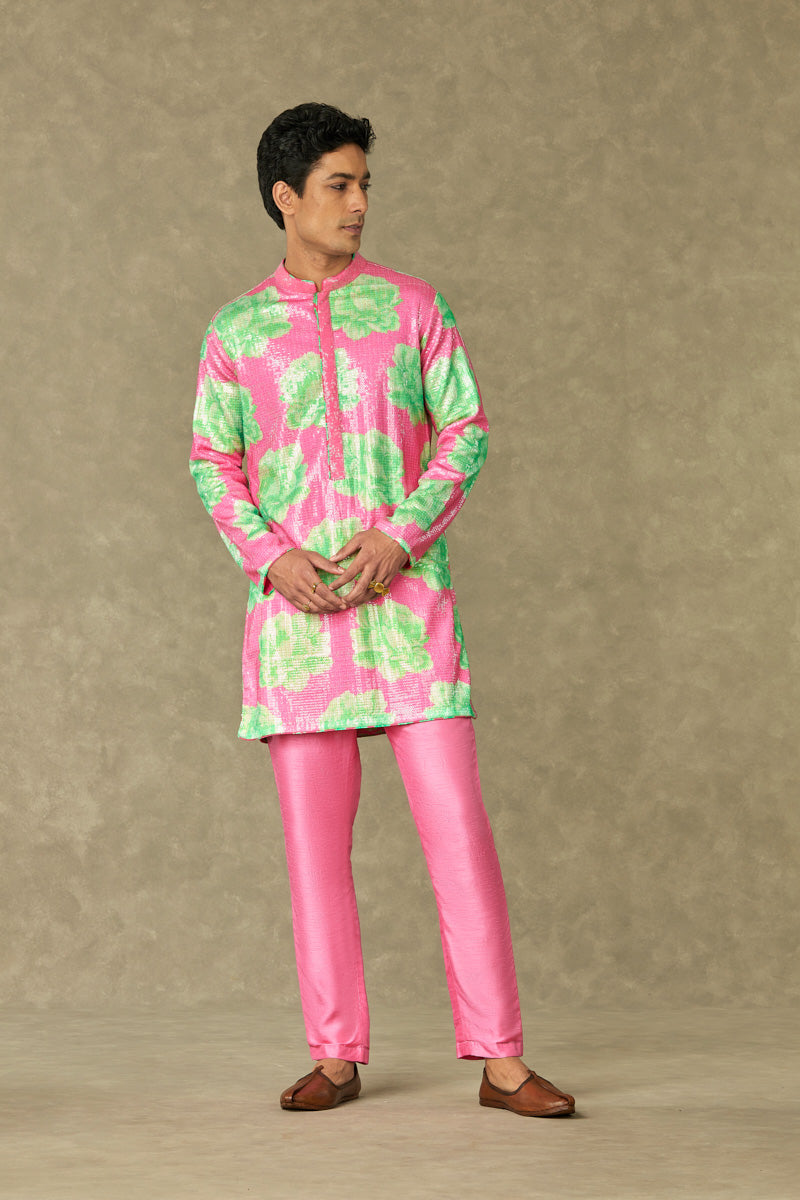 Details: Pink Nurvi Sequin Kurta Set - All over digital printed sequins short Kurta| Full sleeves| Mandarin collar | Concealed placket |Pocket detail Pant- Straight pants with pocket detailing