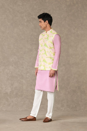 Details: Mint Candy Swirl Set - All over digital printed Bandi adorned with tone on tone dhagai kaam |Center front opening| Mandarin collar | Concealed placket | Welt pockets Kurta- Kurta with full sleeves |Mandarin collar embellished with border | Pocket detail | Concealed placket embellished with border