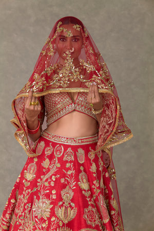 Styling: Pair this Red Bridal Lehenga with traditional gold or kundan jewellery with complementing diamond and gemstone choker, oversized earrings, nose ring, coloured bangles, and comfortable heels for added elegance. Style it with the brocade or tissue dupatta draped elegantly over one shoulder. Layer it with our beautiful trail to cover your head or let it fall over your shoulders cascading down to the floor for a timeless and classic look