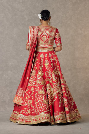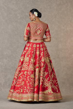 Details: Red Bagh-E-Bahar Neelkamal Lehenga- Lehenga adorned with multi motifs such as Haath-phool, Neel-Kamal, Shajara in dori, multi coloured thread, sitara & moti kaam |Hemline embellished with embroidered Haathphool border and edged with kinari | Pocket detail | Comes with a separate Can Can skirt Blouse- Blouse adorned with dori, multi coloured thread, sitara and moti kaam | 'V' neckline | Elbow sleeves | Printed lining Brocade Dupatta- Brocade dupatta woven in our signature 'Haath-Phool' border and anar buti all over |Embellished with embroidered border and edged with kinari | Tassel Detail Tissue Dupatta- Gold Foil printed tissue dupatta embellished with embroidered border and edged with kinari | Tassel Detail Dupatta- Embroidered Red tulle trail with our signature Neelkamal & Shajara motifs in dori, sitara kaam | Edged with jhallar
