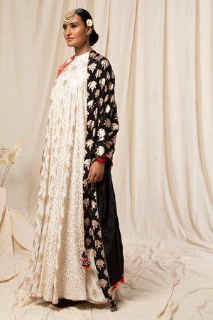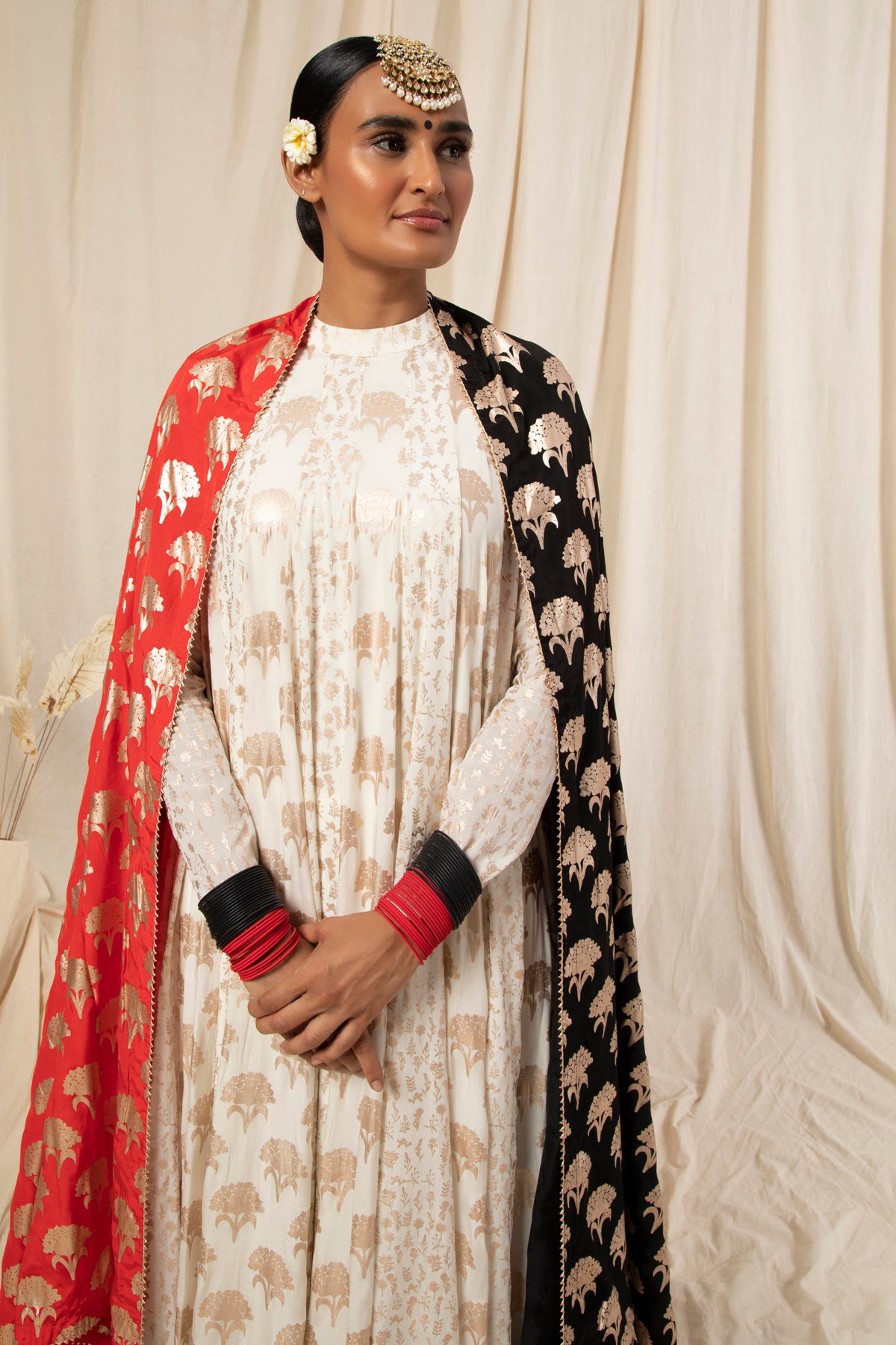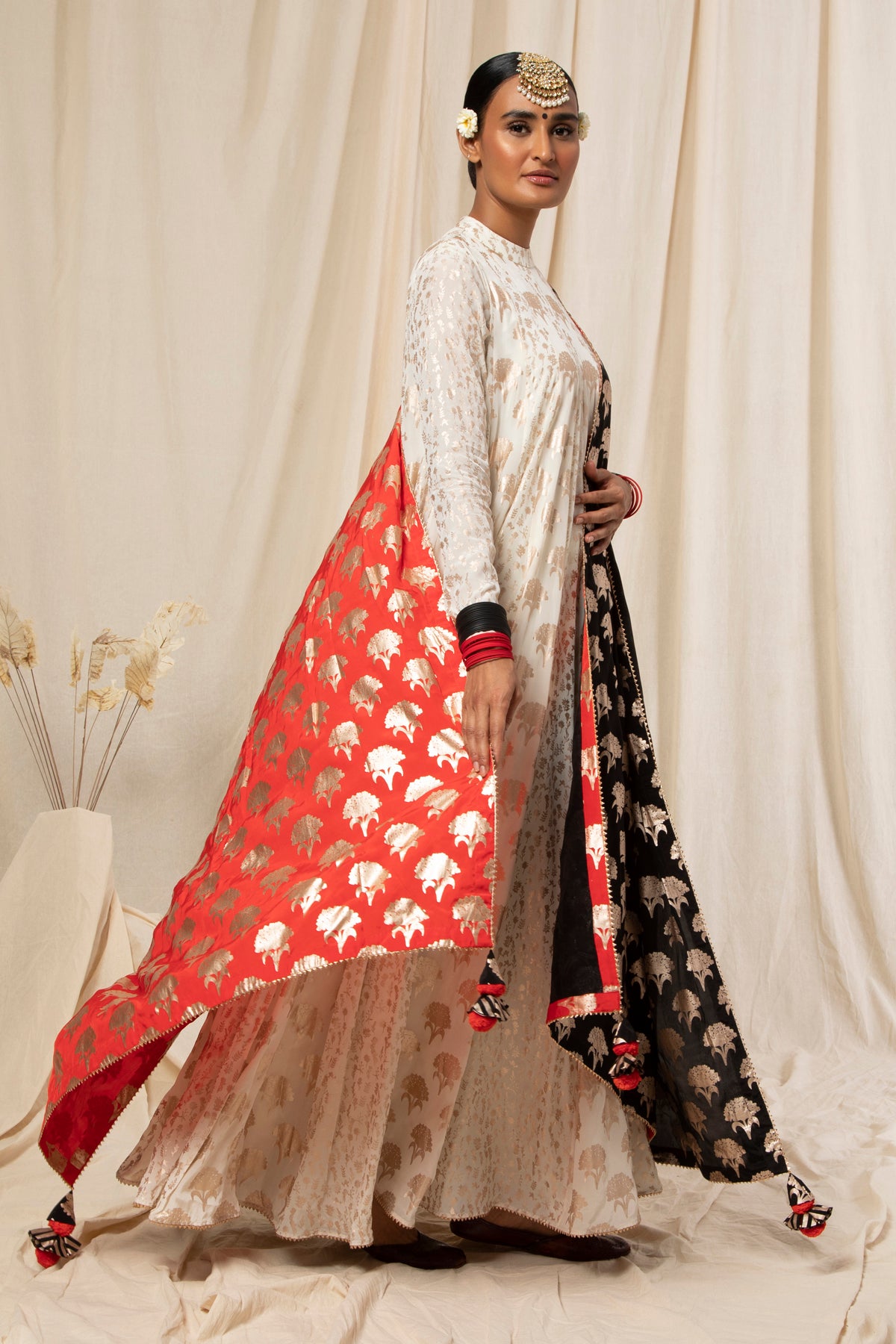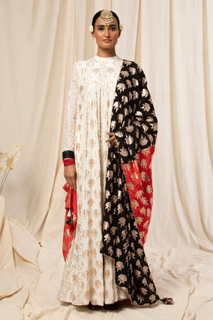 Red & Black Rose Gold Floral Spring Half & Half Dupatta
