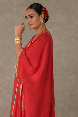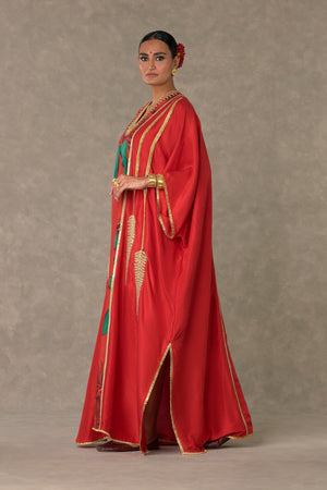 Details: Red Candy Swirl Kaftan - Red Candy swirl patchwork kaftan adorned with trikone dori & sitara kaam | Asymmetrical elbow sleeve | 'V' neckline | Comes with a slip