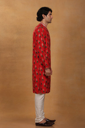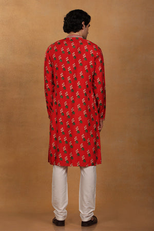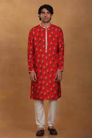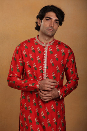 Styling: Pair Red Kurta Set for Men with a pair of mojris.