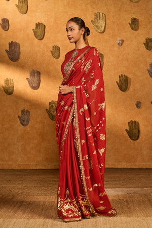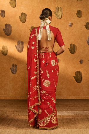 Details: This regal red saree is crafted in luxurious mul silk and adorned with an opulent gold foil print that lends a festive sheen and graceful movement to every drape. Designed in a classic half-and-half layout, the saree effortlessly blends tradition with contemporary aesthetics. It is paired with a coordinating mul silk blouse, richly embroidered on the front to highlight artisanal detail. Elegant yet comfortable, this ensemble is perfect for celebratory evenings where refined elegance takes center stage.