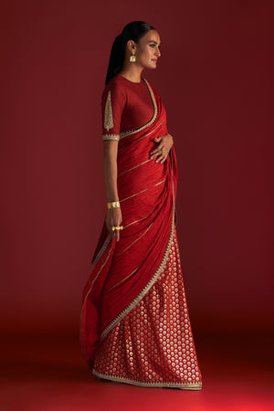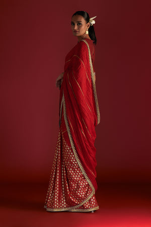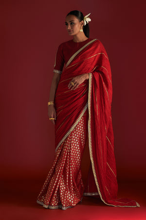 Details: Red Crushed Honeycomb Saree - All over foil print | Embroidered border | Edged kinari | Crushed palla with gota | Signature 'Paan-Patti' motif embroidered blouse piece