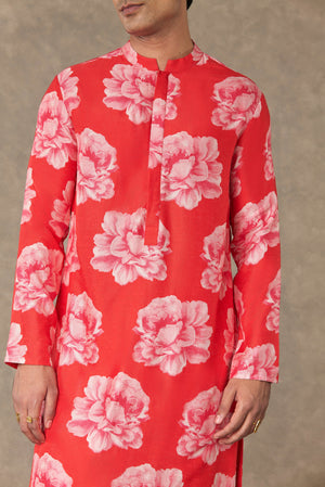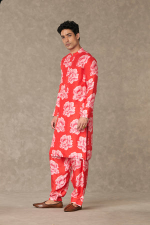 Details: Red Nurvi Sitara Set - Digital placement printed bandi with full sleeves| Mandarin collar | Concealed placket |Center front opening Kurta- All over digital printed kurta | Full sleeves | Mandarin collar | Concealed placket | Pocket detail Salwar- All over digital printed salwar with elasticated waist