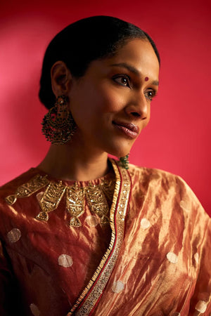 Details: A polka tissue saree featuring a soft sheen and an elegant, fluid drape. An ornate border frames the saree, enhancing its structure and finish. It is paired with a matching blouse designed with embroidery detailing on the neckline.