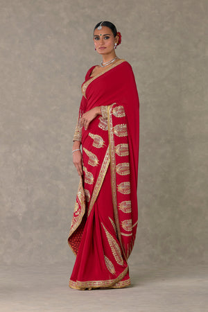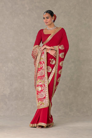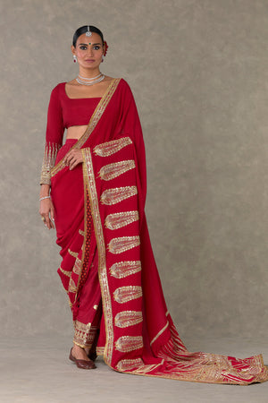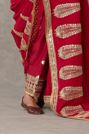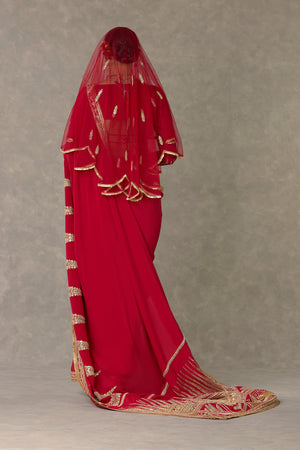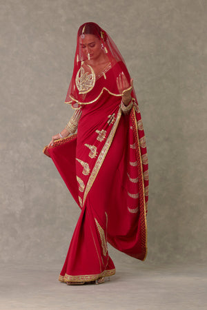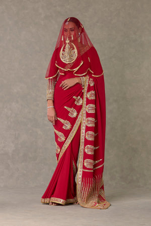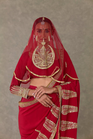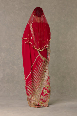 Details: Red Patti Saree - Palla intricately embroidered with signature motifs - Son-Patti, Son-Chidiya & Trikone in dori and sitara kaam |Embellished with embroidered borders | Printed backing Blouse piece - Trikone embroidered blouse piece Salwar - Gold foil printed patiala salwar with ornate borders at the hem | Centre back closure Veil - Sheer veil intricately embroidered with signature Chaand-Phool motif in sitara and pita kaam along with madakal finish